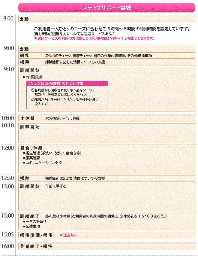 - 通所により、雇用契約に基づく就労の機会を提供するとともに、一般就労に必要な知識、能力が高まった者について、一般就労への移行に向けて支援。